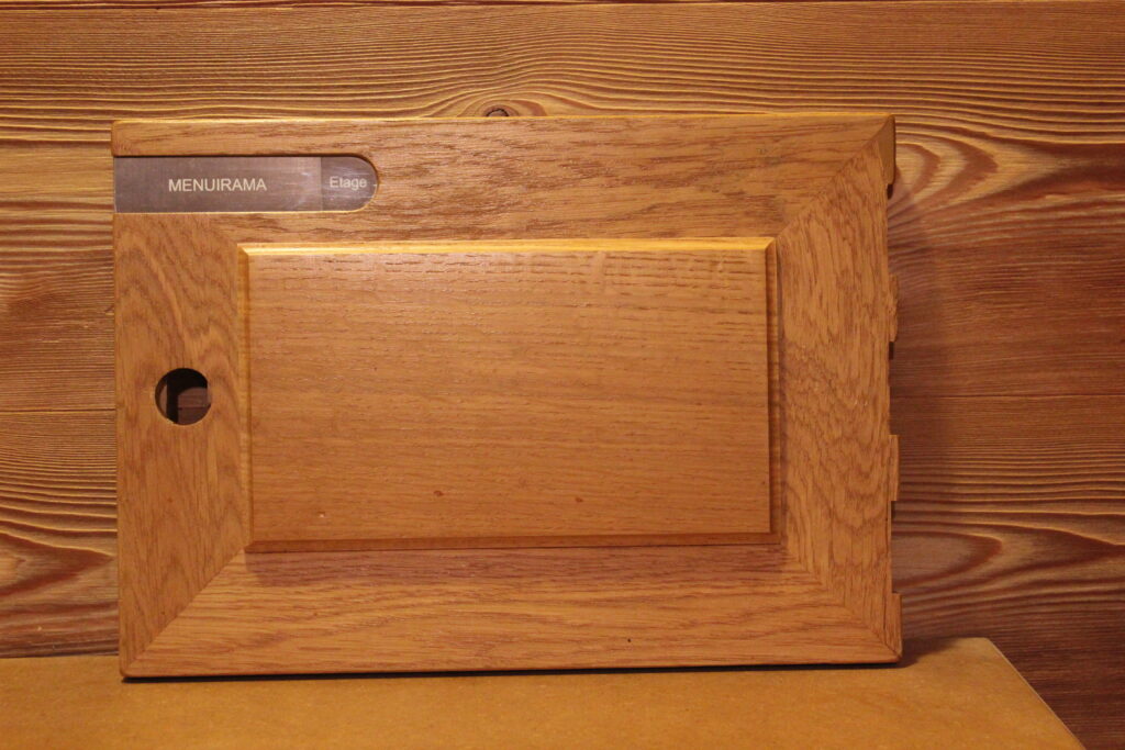 Fabrication en panneaux tout chêne avec 1 âme centrale et 2 parements. Rainure en « V » décorative. Teinte au choix sur toute la palette, teinte sur mesure possible, vernis 2 couches.