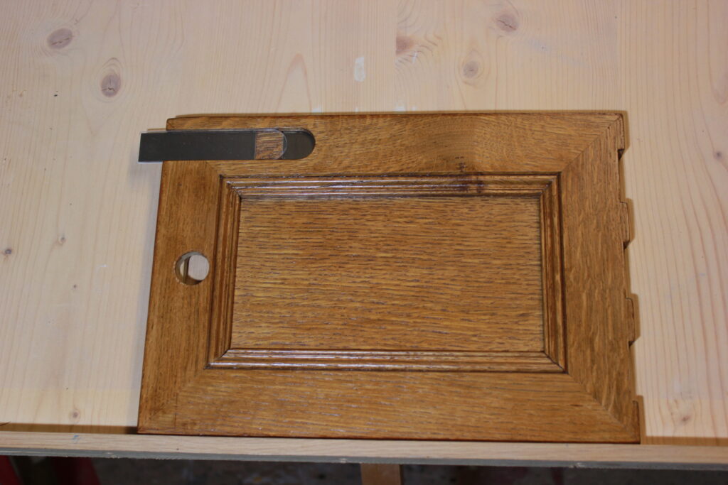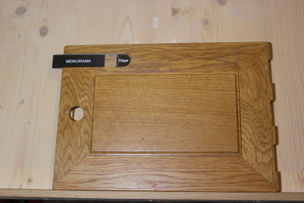 Fabrication en chêne massif et contreplaqué chêne, panneau à table saillant avec 1 profil gorge. Teinte au choix sur toute la palette, teinte sur mesure possible, vernis 2 couches.
